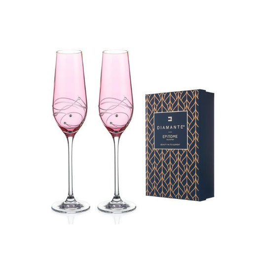 Diamante Pink Champagne Flutes with Spiral Design Cutting - Set of 2 - In Gift Box